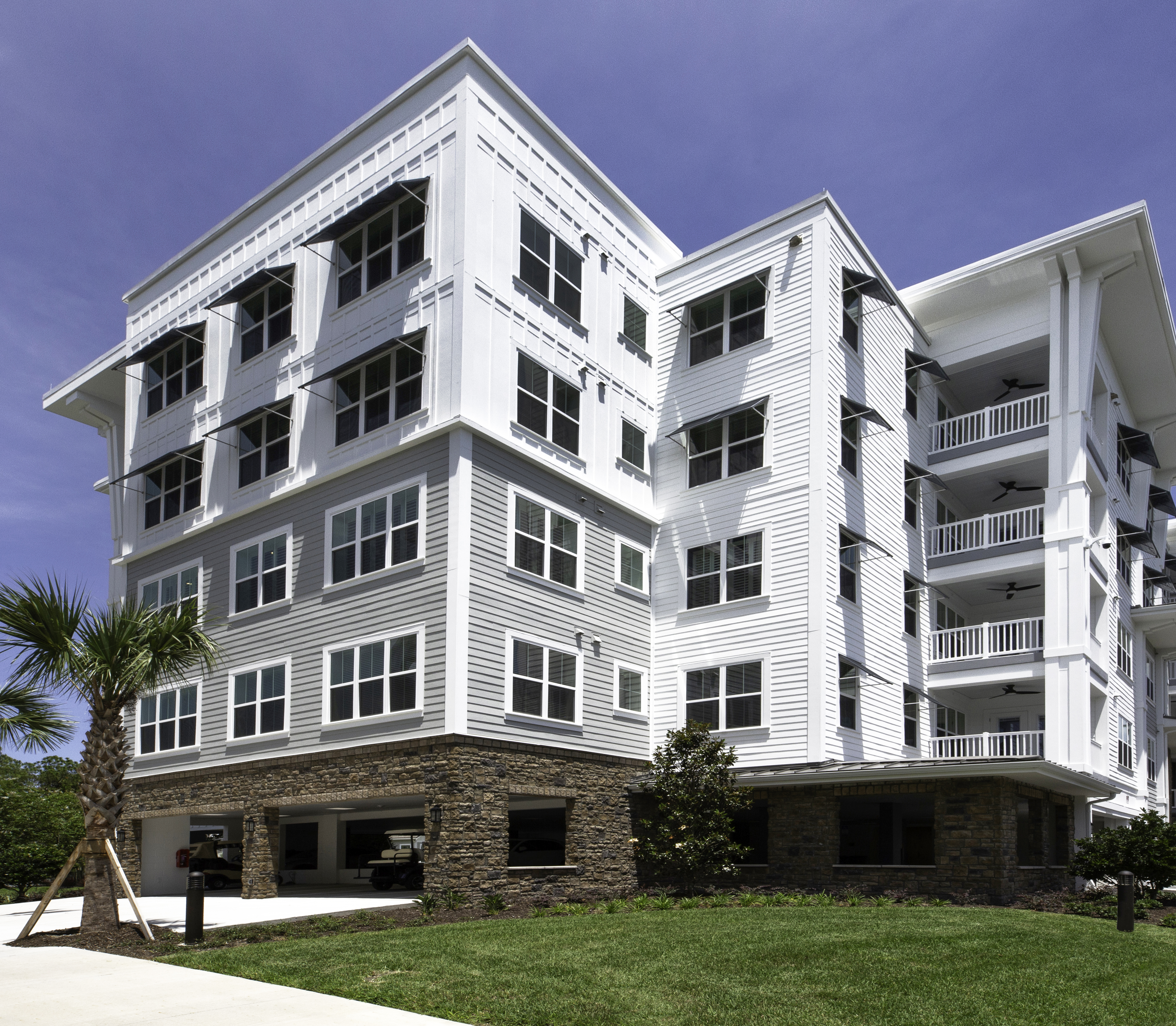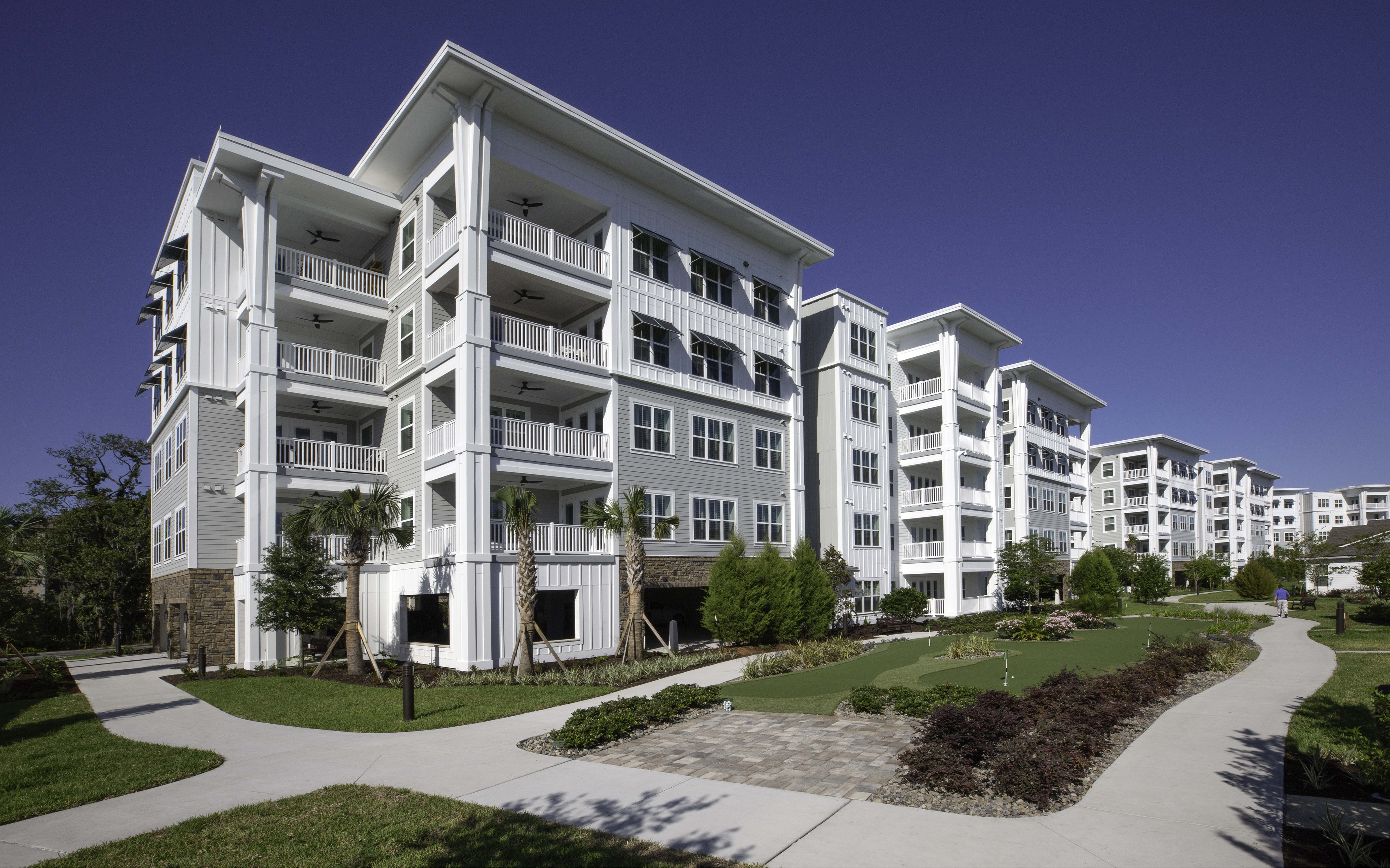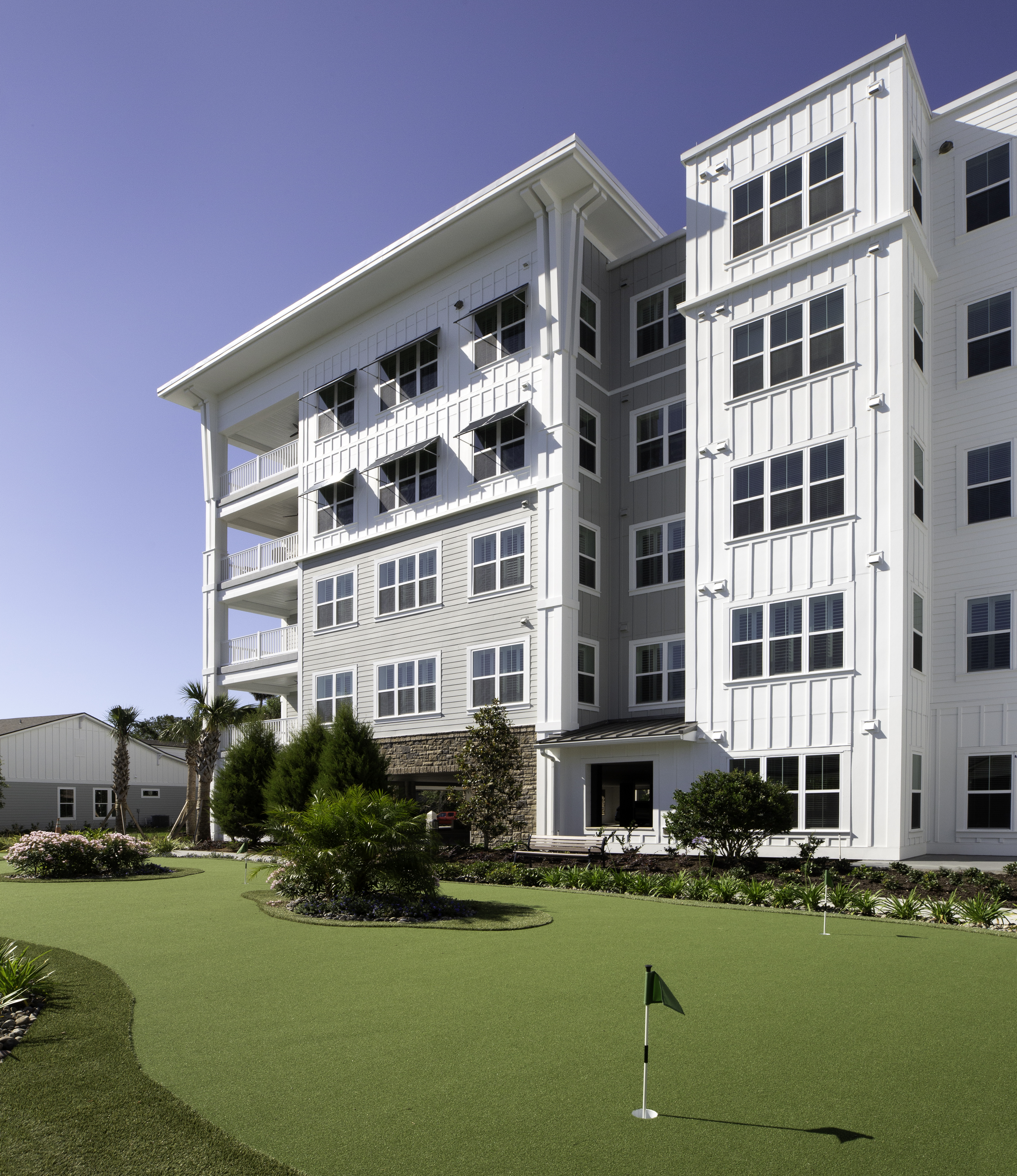 The new Oak Bridge Community for Vicar’s Landing in Ponte Verda Beach, Florida includes four Hybrid Apartment buildings, five Mini-Hybrid Apartment buildings, fourteen Duplex Villas, a Community Center Clubhouse, a Gate House, and an Assisted Living and Memory Care building. This community gives active retirees countless activities as well as access to casual and fine dining.