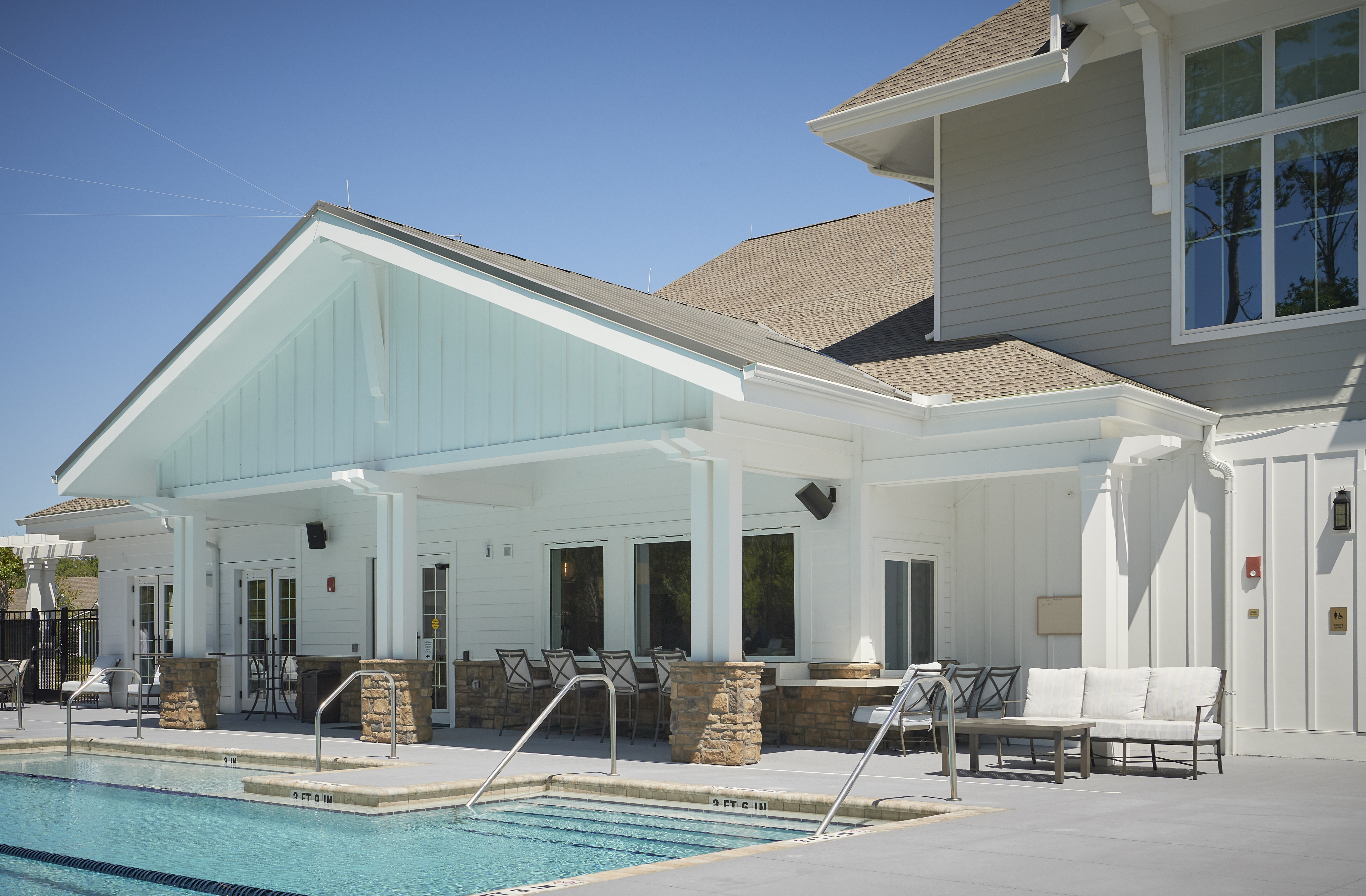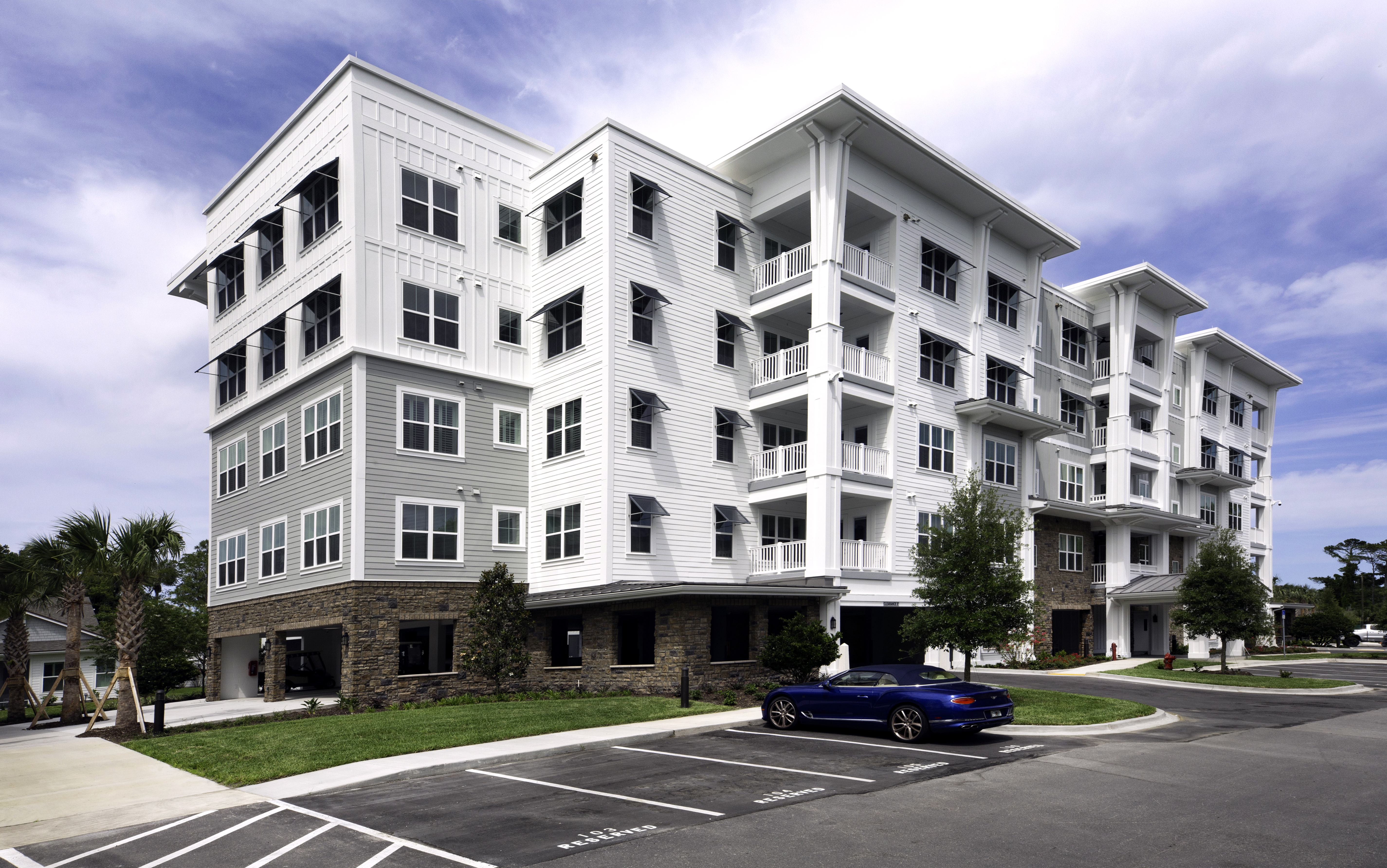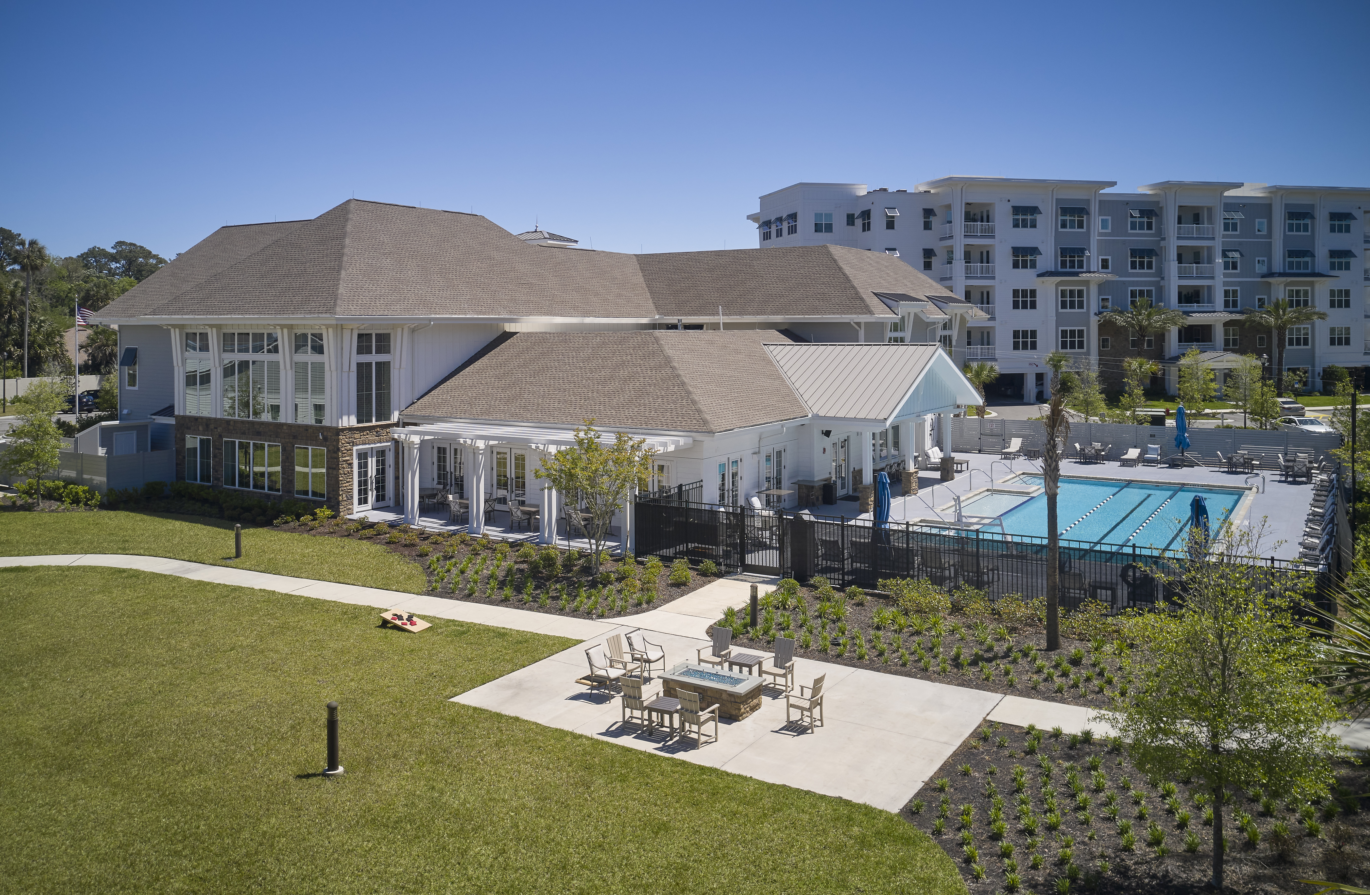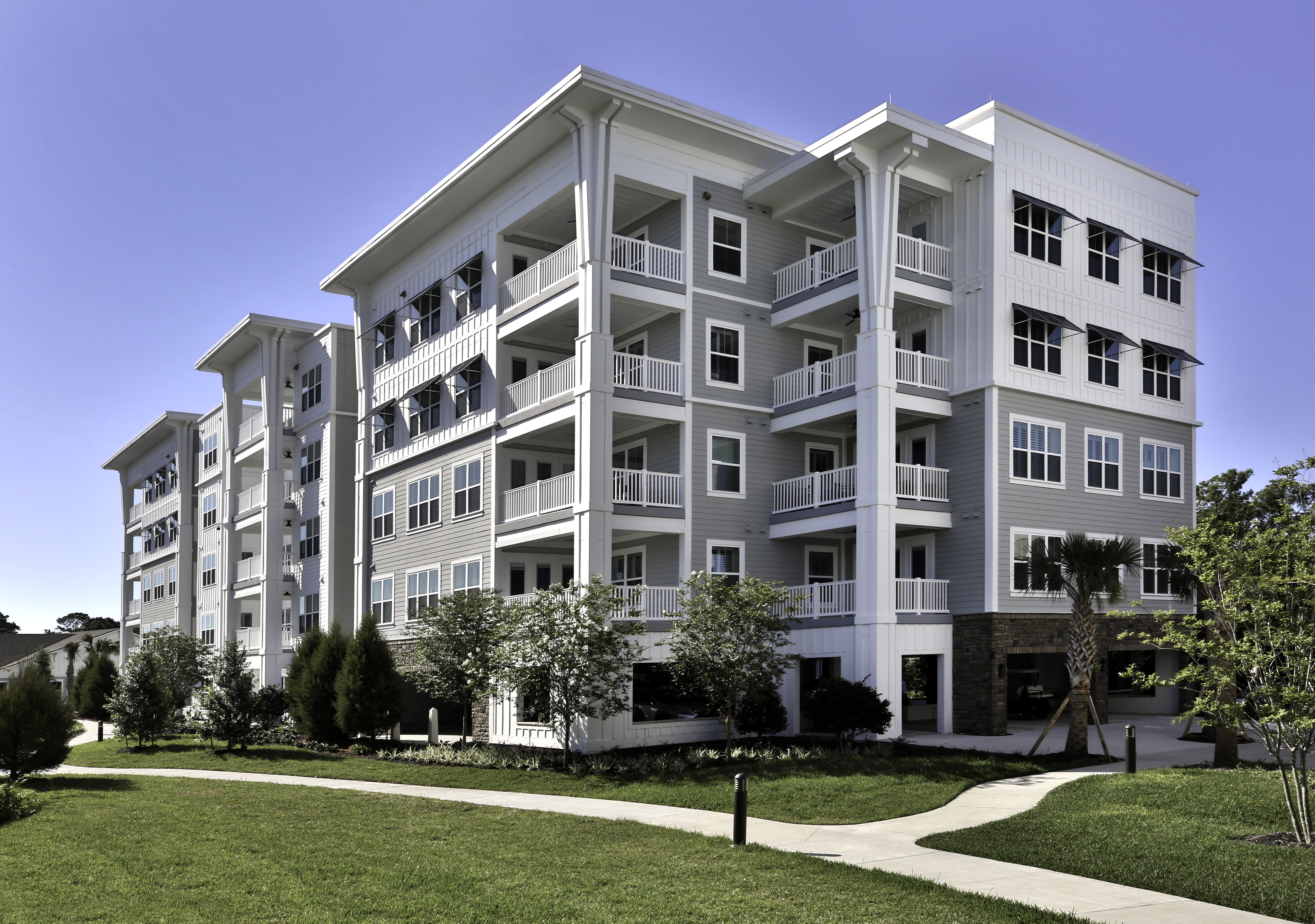 The new Oak Bridge Community for Vicar’s Landing in Ponte Verda Beach, Florida includes four Hybrid Apartment buildings, five Mini-Hybrid Apartment buildings, fourteen Duplex Villas, a Community Center Clubhouse, a Gate House, and an Assisted Living and Memory Care building. This community gives active retirees countless activities as well as access to casual and fine dining.
